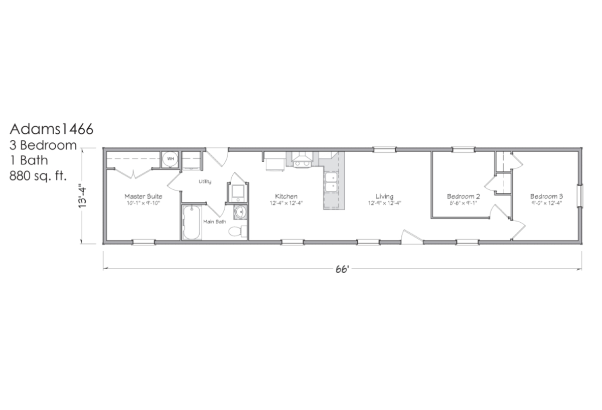3 beds / 1 baths / 880 sq. ft. / 14′ 0″ x 66′ 0″